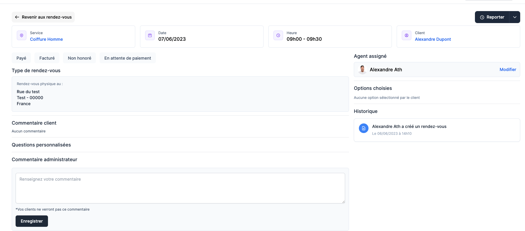 Pour modifier les informations d'un rendez-vous, cliquez sur le rendez-vous que vous souhaitez modifier. Sur la page du rendez-vous en question, vous avez la possibilité de changer le Statut du rendez-vous (Payé, Non honoré, etc.) et l'Agent assigné.